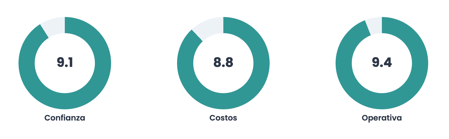 Cada una de las tres secciones principales — Confianza, Costos y Operativa — tiene el mismo peso dentro del puntaje final.